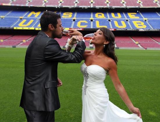 Dvoje navijača nogometnog kluba Barcelone postali su u subotu prvi par koji je sklopio brak na stadionu Camp Nou, objavio je klub na svojoj internetskoj stranici.