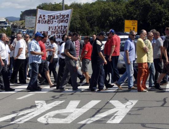 Radnici Dine izgubili su strpljenje i pravdu za neiplaćene plaće potražiti prosvjedom na krčkom mostu gdje su zaustavili promet.