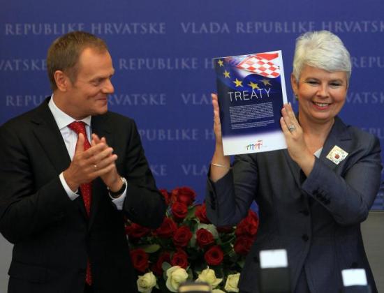 Poljski premijer Donald Tusk uručio je u subotu u Zagrebu predsjednici hrvatske vlade Jadranki Kosor nacrt Ugovora o pristupanju Hrvatske Europskoj uniji, kazavši da bi bio vrlo zadovoljan kada bi taj ugovor bio potpisan u Varšavi, prijestolnici Poljske koja u