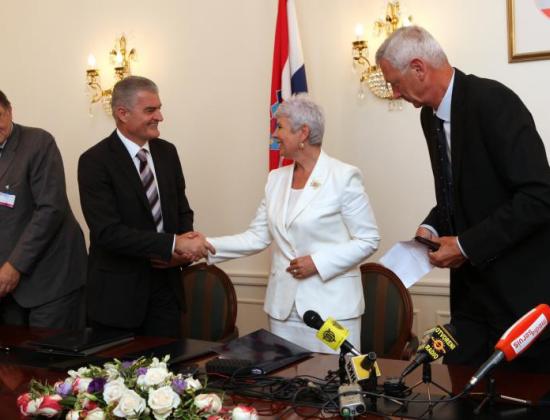Premijerka Jadranka Kosor i čelnici poslovnih banaka potpisali su u Banskim dvorima dodatak memorandumu o mjerama za ublažavanje položaja korisnika stambenih kredita uz valutnu klauzulu u švicarskim francima kojim se predviđa fiksiranje teča