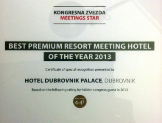 Prema izboru stručnog magazina Kongres, Hotel Dubrovnik Palace dobitnik je nagrade za najbolji hotel u kategoriji PREMIUM RESORT MEETING HOTELS te je dobio priznanje MEETINGS STAR 2013.Meetings Star regionalna je nagrada za iznimna ostvarenja u kongresnom turizmu ju