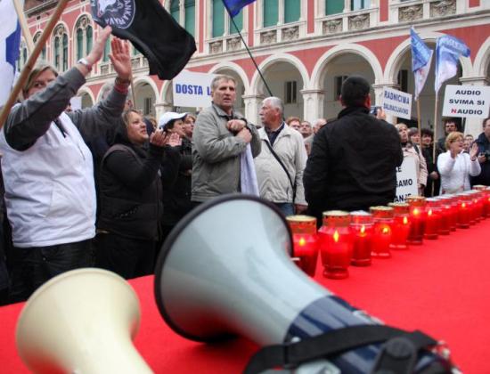 Na prosvjednom skupu na splitskim Prokurativama, održanom u organizaciji Hrvatske udruge sindikata, govornici su upozorili na teško stanje gospodarstva u Splitsko-dalmatinskoj županiji i oštro kritizirali Vladu, a predsjednik HUS-a Ozren Matijašević je najavio potpisivanje n