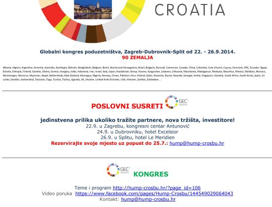 Ovogodišnji Globalni kongres poduzetništva (GEC) održat će se od 22.-26. rujna 2014. i to u čak tri hrvatska grada: Zagrebu, Splitu i Dubrovniku.