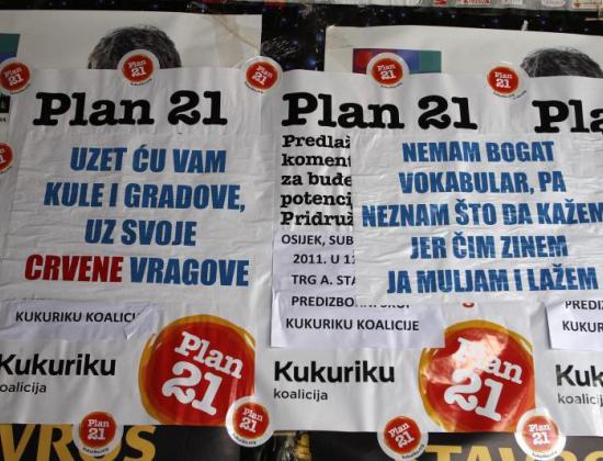 Plakati s izbornim porukama Kukuriku koalicije u Osijeku i njihovim Planom 21 u središtu Osijeka su napadnuti porukama podrugljivog sadržaja.
