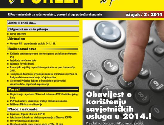 Novi broj časopisa Računovodstvo i porezi u praksi za ožujak je u tisku, a kod pretplatnika će biti u srijedu, 12. ožujka. I u broju ožujak donosimo niz aktualnosti iz područja prava, poreza, propisa i računovodstva.