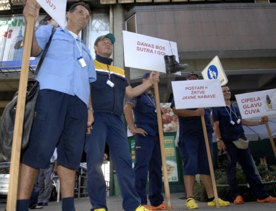 Petnaestak članova Republičkog sindikata radnika Hrvatske (RSRH) prosvjedovalo je na riječkom Korzu jer radnicima Hrvatske pošte nije osigurana službena radna obuća.