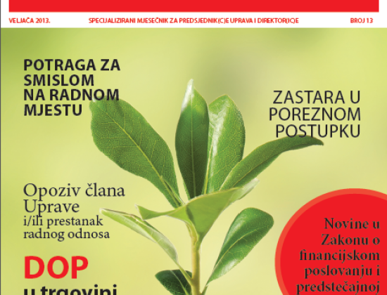 Zaključen je novi broj mjesečnika Direktor. U ovom broju čekaju vas savjeti vezani uz porezne olakšice za reinvestiranu dobit, novine u Stečajnom zakonu, savjeti kako poboljšati svoje upravljanje te detalji oko zastare u poreznom postupku...
