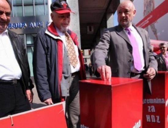 Blok umirovljenici zajedno je postavio na Trgu bana Jelačića škrabice pozivajući građane da ubace dobrovoljne novčane priloge i da se tako skuplja otpremnina za HDZ da ode s vlasti i za SDP da na vlast ne dođe.