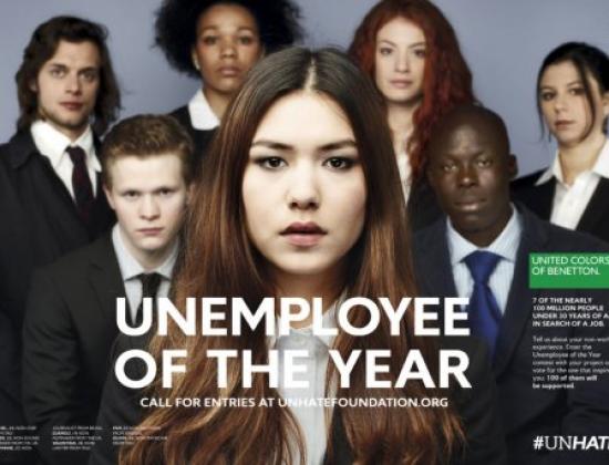 Benetton koji je poznat po kontroverznim kampanjama, ima novu naziva "Unhate" kojom se bori protiv nezaposlenosti i poziva 100 milijuna nezaposlenih mlađih od trideset godina da im pošalju svoje ideje.