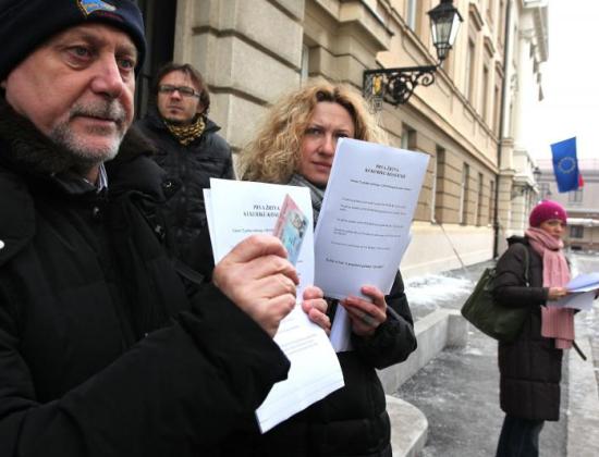 Nakon najave potpredsjednika Vlade Radimira Čačića da Vjesnik odlazi u stečaj, Vjesnikovi novinari su na Markovom trgu dijelili letke saborskim zastupnicima, piše bankmag
